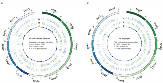 It is noteworthy that the number of PPR genes with a single exon in O. rufipogon displayed a significant decrease compared to cultivated rice, while the number of PPR genes with five or more exons exhibited a significant increase. There were no significant changes observed in the quantities of PPR proteins with other numbers of exons. The results indicated that PPR genes in these two species were extensively and unevenly distributed across the 12 chromosomes (Figure 1d; Table S1). Both rice species exhibited the highest number of PPR genes on Chromosome 1; cultivated rice exhibited the fewest number on Chromosome 9, while O. rufipogon had the fewest number on Chromosome 11 (Figure 1d; Table S2). Our results showed that the P-subclass and PLS-subclass of the PPR genes were widely but unevenly positioned across 12 chromosomes (Figure 2). However, O. sativa and O. rufipogon exhibited similar distribution of PPR genes. Compared to eleven other chromosomes, they were densely distributed on Chromosome 10 for both rice species.