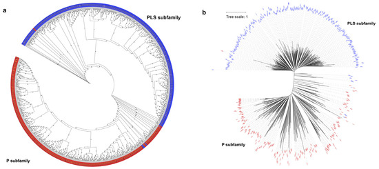 Based on the full amino acid sequences of PPR genes in the two species, a phylogenetic tree was constructed using the Maximum Likelihood (ML) method. The phylogenetic tree was divided into two distinct groups, known as the P and PLS subfamilies (Figure 3a,b). A small subset of P-class genes clustered within the PLS class subfamily, including genes such as LOC_Os09g26190, RUF029470, LOC_Os07g46730, and RUF025381. PLS-class genes also clustered within the P-class subfamily, including RUF012986, LOC_Os03g62400, RUF002433, and LOC_Os01g42280. Such an observation is similar to the previous phylogenetic analysis of the PPR gene family in poplar [5].