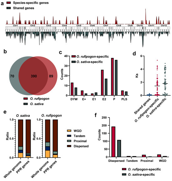 Shared and species-specific genes between O. sativa and O. rufipogon. (a) Chromosomal distribution of shared and species-specific PPR genes in the O. sativa and O. rufipogon genomes. The intensity of chromosome band color indicates the density of PPR genes. Red represents species-specific genes, while dark green denotes shared genes; (b) number of shared and species-specific PPR genes between O. sativa and O. rufipogon; (c) PPR subfamilies of specific genes in O. sativa and O. rufipogon; (d) Ks values of shared gene pairs and the smallest Ks values of paralogous genes for specific genes within their own genomes; © composition of gene duplication types for the whole genome and PPR genes in O. sativa and O. rufipogon; (f) composition of gene duplication types of species-specific genes in O. sativa and O. rufipogon.