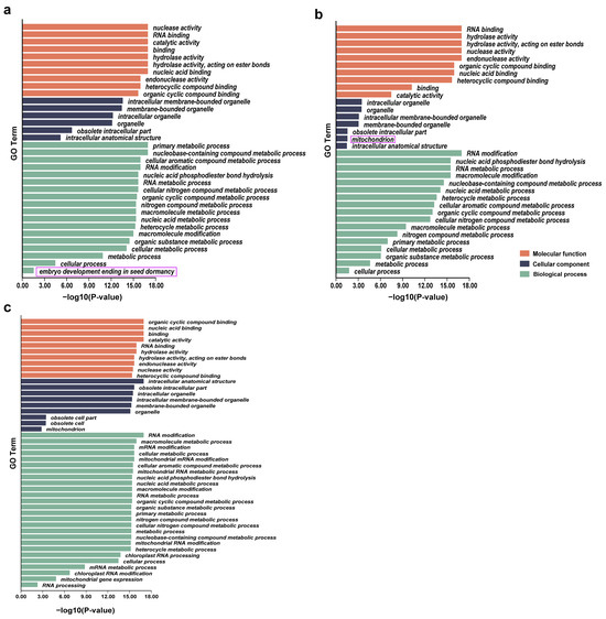 We further conducted Gene Ontology (GO) enrichment analysis of PPR genes uniquely identified in O. sativa and O. rufipogon (Figure 5). Interestingly, PPR genes in O. sativa exhibited an enrichment of a unique biological process related to the termination of embryo development and seed dormancy, indicating that the presence of specific PPR genes may be functionally related to embryo development and reduced seed dormancy during the domestication from wild rice to cultivated rice. The genes involved in this process included LOC_Os11g03850, LOC_Os12g42120, LOC_Os03g19650, LOC_Os11g43800, LOC_Os06g09880, LOC_Os02g43080, and LOC_Os05g30240 (Figure 5a). It is worth noting that PPR genes in O. rufipogon displayed enrichment of the mitochondria, as a cellular component. These genes contained RUF036508, RUF037041, RUF037004, RUF006046, RUF002492, RUF004777, and RUF030818 (Figure 5b). GO enrichment analysis of a total of 390 shared PPR genes (Figure 5c) revealed that, compared to unique PPR genes, there were two additional components in the cellular component category (intracellular anatomical structure and obsolete cell).