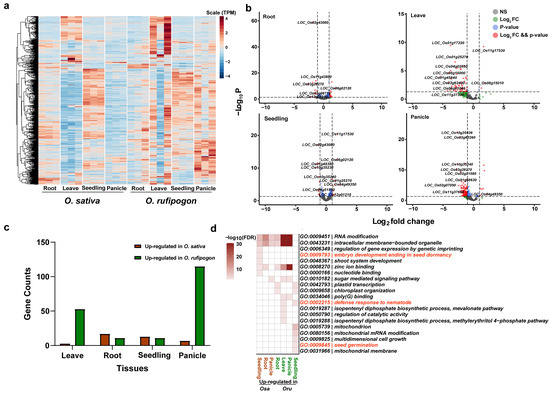 To measure the differential expression of PPR genes between the two rice species, we further mapped the RNA-Seq data to the MSU7 genome and identified differentially expressed genes (DEGs). We observed the different expression patterns of PPR genes in the panicle tissue in the heatmap of the expression matrix (Figure 6a). Based on the criteria of Fold Change > 2 and P-adj < 0.05, we identified 28 DEGs in the root tissue, 56 DEGs in the leaf tissue, 24 DEGs in the seedling, and 122 DEGs in the panicle (Figure 6b). Notably, within the panicle DEGs, the fertility restoration gene Rf1 (LOC_Os10g35436) with the highest fold change, and another fertility restoration gene, LOC_Os10g352140, were also upregulated in O. rufipogon. We further categorized the DEGs into genes upregulated in O. sativa and upregulated in O. rufipogon. We found that, in the root and seedling tissues, O. sativa had more upregulated genes, with 17 and 13 genes showing increased expression in the root and seedling, respectively (Figure 6c). We subsequently carried out functional annotation and GO enrichment analysis on genes upregulated in both O. sativa and O. rufipogon across various tissues. We discovered that genes upregulated in the seedling tissue of O. sativa were enriched in the biological process term “embryo development ending in seed dormancy.” However, all these genes were shared genes between O. sativa and O. rufipogon. In the leaf tissue of O. rufipogon, upregulated PPR genes were enriched in the “defense response to nematode” biological process term. In the seedling tissue, upregulated PPR genes were enriched in the “seed germination” biological process term (Figure 6d).