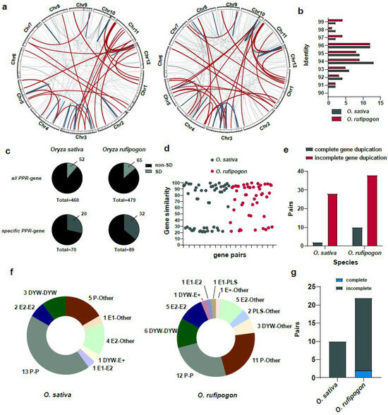 Segmental duplications facilitate incomplete gene duplications and promote the birth of new PPR genes. (a) PPR genes arising from segmental duplications in the O. sativa and O. rufipogon genomes. Left panel: O. sativa; right panel: O. rufipogon. Red lines represent inter-chromosomal duplications, dark green lines indicate intra-chromosomal duplications, and light gray lines denote other types of segmental duplications. 1 Mb sliding window with the shading indicates the density of PPR genes on each chromosome; (b) distribution of identities of segmental duplications. Dark green represents O. sativa, while red indicates O. rufipogon; (c) proportion of PPR genes derived from segmental duplications among all PPR genes and species-specific PPR genes; (d) protein similarity between duplicated genes arising from segmental duplications. Each dot represents the similarity between a pair of duplicated genes; (e) pairs of complete and incomplete gene duplications through segmental duplications; (f) numbers and proportions of duplicated genes across subfamilies with “Other” denoting non-PPR paralogous genes; (g) number of duplications between PPR genes and non-PPR genes in O. sativa and O. rufipogon.