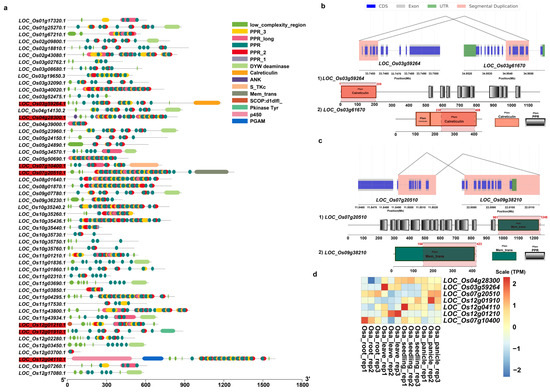 Domain composition of PPR genes produced by SDs in O. sativa. (a) Domain composition of 52 PPR genes generated by segmental duplications. Genes marked in red indicate that the protein product contained domains other than PPR domain; (b) incomplete gene duplications occurred in PPR genes that acquired domains from other proteins such as (b) LOC_Os03g59264 and (c) LOC_Os7g20510. Pink represents homologous regions of segmental duplications. The structures of paralogous genes are depicted; coding sequences are represented in blue, exon sequences are represented in gray, and UTR regions are represented in green. The annotation of domain composition of the homologous genes is shown below; the gene structure with the homologous regions is marked in red and the location of homologous region is also labeled; (d) expression profiling of 7 PPR genes with other domains.