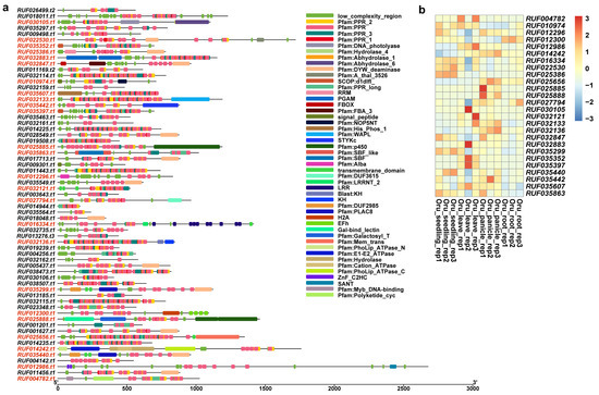Domain composition of PPR genes produced by SDs in O. rufipogon. (a) Domain composition of 65 PPR genes duplicated by segmental duplications. Genes marked in red indicate that the protein product of the gene contains domains other than PPR domain; (b) expression of 26 PPR genes with other domains.
