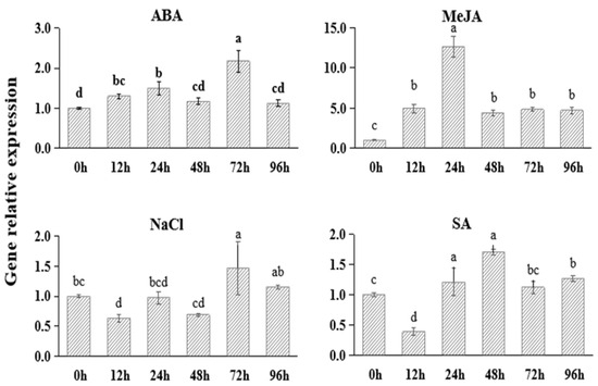 Gene expression analysis of FtNAC10 under different stress treatments in F. tataricum seedling. The seedlings were collected at 0, 12, 24, 48, 72 and 96 h after salt (100 µM NaCl), 100 µM abscisic acid (ABA), 100 µM methyl jasmonate (MeJA) and 100 µM salicylic acid (SA) treatment, respectively. Error bars indicate SE (n = 3). Different lowercase letters indicate significant difference (LSD test, p < 0.05).