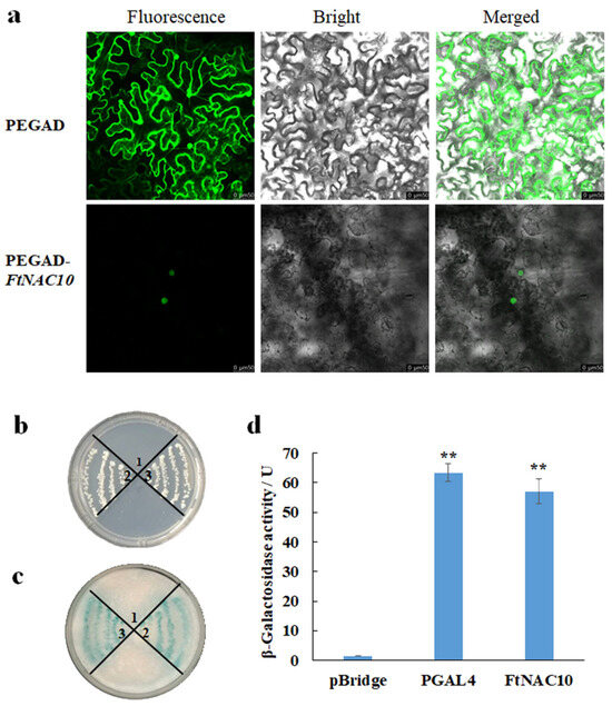 Subcellular localization and transcription activation activity analysis of FtNAC10. 1, 2, and 3 represented pBridge, pBridge-PGAL4, and pBridge-FtNAC10, respectively. (a) Subcellular localization of FtNAC10 determined by transforming N. benthamiana leaves epidermal cells with PEGAD-GFP and PEGAD-FtNAC10-GFP; (b) yeast cultured on SD\-Trp-His; (c) The activity analysis results of filter paper. (d) Analysis of β-galactosidase activity (** p < 0.01). Scale bar = 50 µm.