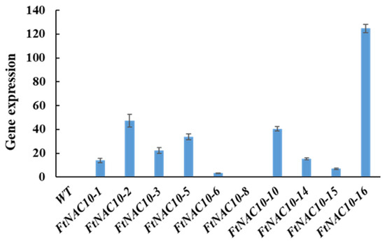 Gene expression analysis of FtNAC10 in transgenic A. thaliana. WT represents control group, 1–16 represent FtNAC10 A. thaliana transgenic lines.