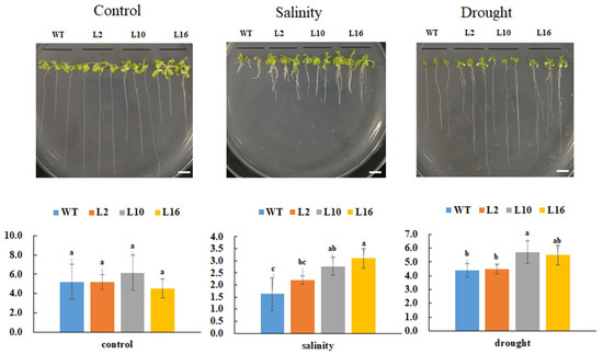 Primary root length analysis of FtNAC10 transgenic A. thaliana lines under salinity, and drought stress. The stress treatments were salinity (150 mM NaCl), drought (300 mM Mannitol), respectively. WT, L2, L10 and L16 represent wild type, FtNAC10 transgenic lines L2, L10 and L16. All treatments were repeated three times for each line and the data represent means ± SE. Significant differences in root length between different transgenic lines were analyzed at level of 0.05. Different lowercase letters indicate significant difference (LSD test, p < 0.05). Scale bar = 1 cm.
