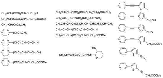 - Marchant, Y.Y.; Ganders, F.R.; Wat, C.K.; Towers, G.N. Polyacetylenes in Hawaiian Bidens. Biochem. Syst. Ecol. 1984, 12, 167–178. [Google Scholar] [CrossRef]