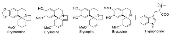 - Folkers, K.; Koniuszy, F. Erythrina alkaloids. IX. Isolation and characterization of erysodine, erysopine, erysocine and erysovine. J. Am. Chem. Soc. 1940, 62, 1677–1683. [Google Scholar] [CrossRef]
