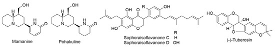 - Kadooka, M.M.; Chang, M.Y.; Fukami, H.; Scheuer, P.J.; Clardy, J.; Solheim, B.A.; Springer, J.P. Mamanine and pohakuline, two unprecedented quinolizidine alkaloids from Sophora chrysophylla. Tetrahedron 1976, 32, 919–924. [Google Scholar] [CrossRef]