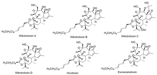 - Jolad, S.D.; Hoffmann, J.J.; Timmermann, B.N.; Schram, K.H.; Cole, J.R.; Bates, R.B.; Klenck, R.E.; Tempesta, M.S. Daphnane diterpenes from Wikstroemia monticola: Wikstrotoxins A–D, huratoxin, and excoecariatoxin. J. Nat. Prod. 1983, 46, 675–680. [Google Scholar] [CrossRef]