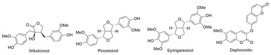 - Torrance, S.J.; Hoffmann, J.J.; Cole, J.R. Wikstromol, antitumor lignan from Wikstroemia foetida var. oahuensis Gray and Wikstroemia uva-ursi Gray (Thymelaeaceae). J. Pharm. Sci. 1979, 68, 664–665. [Google Scholar] [CrossRef]