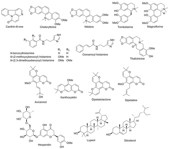- Arslanian, R.L.; Mondragon, B.; Stermitz, F.R.; Marr, K.L. Acyl histamines and a rare protopine-type alkaloid from leaves of Zanthoxylum dipetalum. Biochem. Syst. Ecol. 1990, 18, 345–347. [Google Scholar] [CrossRef]