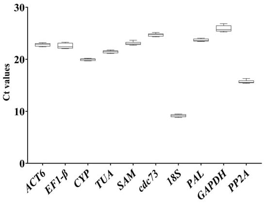 2.3. Expression Stability Analysis of Candidate Reference Genes