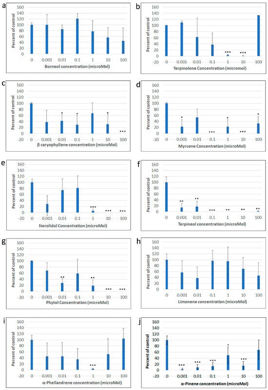 Graphs showing mean ± SEM capsaicin response amplitudes normalised to vehicle treated controls, in the presence of Borneol (a) Terpinolene (b), β-caryophyllene (c), myrcene (d), nerolidol (e), terpineol (f), phytol (g), limonene (h), α-phellandrene (i) and α-pinene (j) at different doses (n = 3–4 rats/terpene). Capsaicin response amplitudes were significantly reduced compared to vehicle treated controls as indicated * p < 0.05, ** p < 0.01, *** p < 0.001 Unpaired T-test.