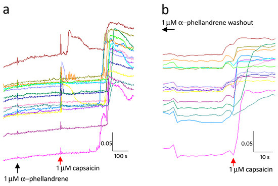After confirming the TRPV1 inhibitory effects of all the terpenes at different concentrations, we examined the mechanism of action of this effect. Neurons demonstrating delayed capsaicin responses in the presence of 1 µM α-phellandrene (Figure 3), showed immediate and sustained capsaicin responses similar to controls, after washout of medium, and capsaicin application 45 min later, in the absence of α-phellandrene. Similarly, capsaicin response delay due to α- pinene was also reversed after washout.