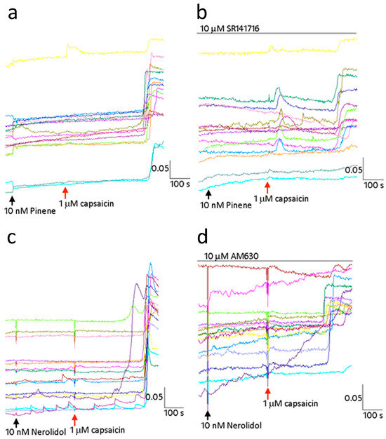 Neurons demonstrating delayed capsaicin responses in the presence of terpenes, had a change of medium and rest period of 45 min to overcome desensitization due to capsaicin application. Further application of terpineol, nerolidol, myrcene, or caryophyllene in the presence of the CB1 receptor antagonist SR141716A or the CB2 antagonist AM630, failed to restore calcium influx in response to capsaicin (Figure 5a–d).