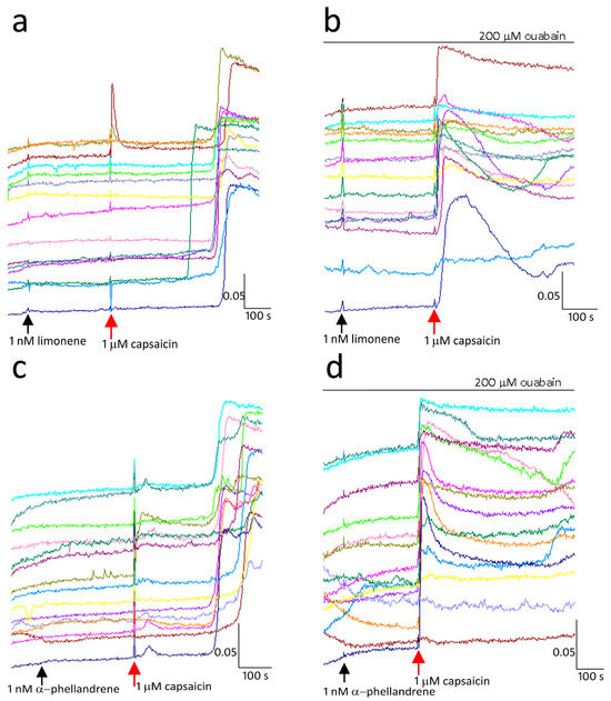 Normal latency, i.e., immediate calcium influx in response to capsaicin, was restored in the presence of the Na+/K+ ATPase inhibitor ouabain. Capsaicin response inhibition due to 0.001 µM limonene (Figure 6a), was reversed 45 min after medium washout, in the presence of 200 µM ouabain (Figure 6b). Similarly, capsaicin responses inhibited by 0.001 µM α phellandrene (Figure 6c), were restored in the presence of 200 µM ouabain (Figure 6d).