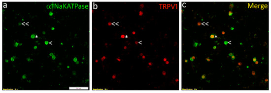 In order to determine the co-expression of the capsaicin receptor TRPV1 and the ouabain sensitive α1Na+/K+ ATPase, we double immunostained DRG neurons for these targets. The findings showed that some neurons were positive for either α1Na+/K+ ATPase, or TRPV1 alone, while others showed co-localization of both (Figure 8a–c).