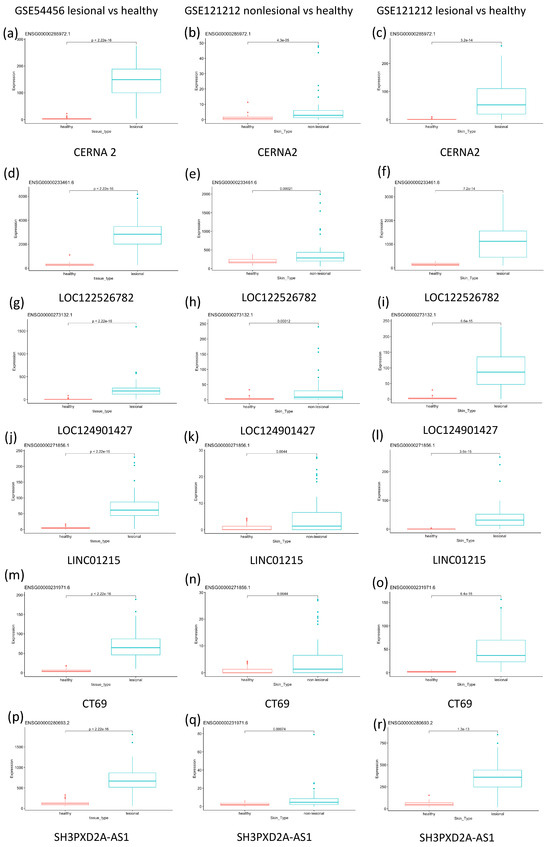 - Gupta, R.; Ahn, R.; Lai, K.; Mullins, E.; Debbaneh, M.; Dimon, M.; Arron, S.; Liao, W. Landscape of long non-coding RNAs in psoriatic and healthy skin. J. Investig. Dermatol. 2016, 136, 603–609. [Google Scholar] [CrossRef] [PubMed]