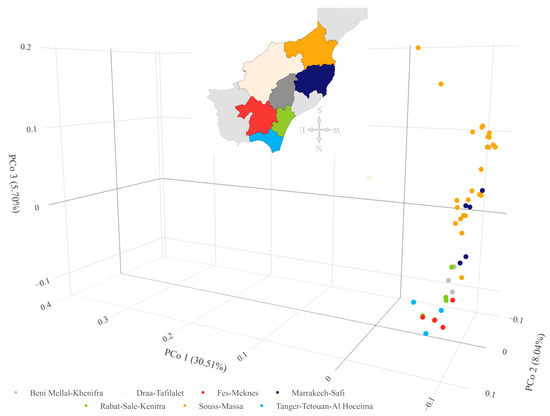 - Peakall, R.; Smouse, P.E. GenAlEx 6.5: Genetic analysis in Excel. Population genetic software for teaching and research—An update. Bioinformatics 2012, 28, 2537–2539. [Google Scholar] [CrossRef]
