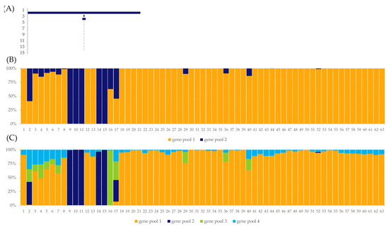 - Evanno, G.; Regnaut, S.; Goudet, J. Detecting the number of clusters of individuals using the software STRUCTURE: A simulation study. Mol. Ecol. 2005, 14, 2611–2620. [Google Scholar] [CrossRef]