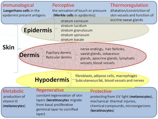The consequences of burns are extremely serious considering the fact that the skin is the largest organ in the human body, accounting for approximately 8% of total body weight. Human skin covers an area of 1.2 to 2.2 m2 and is 0.5 to 4.0 mm thick [16]. It consists of several layers: the outermost epidermis, the dermis (papillary and reticular) and the subcutaneous tissue, which perform different physiological functions (Figure 2).