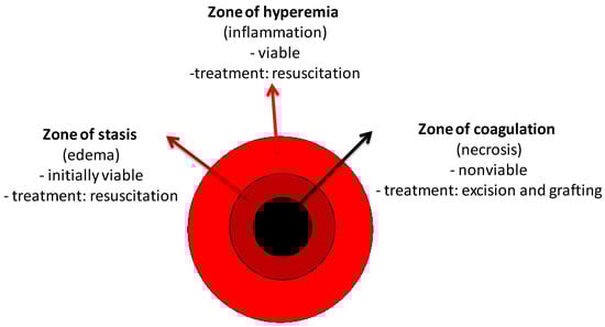 A burn is a condition in which the skin barrier is disrupted by external thermal, chemical, or electrical factors. When the integrity of the skin is altered, its functions are compromised and we are more susceptible to dehydration, infection, metabolic disorders, or even death. Histologically, the area of injury is divided into the three zones, described by Jackson in 1947 [17,18] (Figure 3). The skin has a high regenerative potential, but when it is injured beyond the reticular dermis, its regenerative capacity is reduced [19]. The process of wound healing involves three distinct phases: inflammation, which involves coagulation, cytokine release, chemotaxis, and cell recruitment; proliferation, which is the process of dermal resurfacing with phases of angiogenesis and fibroplasia; and finally, maturation, which involves the extracellular matrix [20,21]. Closure of the wound results in the formation of scar tissue. During this final stage of healing, there is a possibility of hypertrophic scarring, which causes contractions.