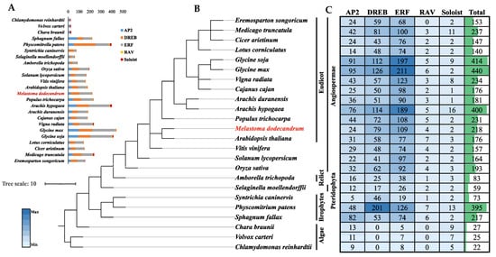 We downloaded 176 Arabidopsis AP2/ERF predicted amino acid sequences from the Plant Transcription Factor Database (PlantTFDB V5.0). The protein sequences of 218 MedAP2/ERFs from M. dodecandrum and 176 AtAP2/ERFs from A. thaliana were used to construct basic phylogenetic trees. Multiple sequence alignment was performed using PhyloSuite v1.2.2 software [45]. Phylogenetic trees were constructed by the maximum likelihood method (with 1000 bootstrap replicates) using the IQtree from PhyloSuite. The APG IV system locations of the 24 species were constructed using NCBI CommonTree (https://www.ncbi.nlm.nih.gov/taxonomy/CommonTree, accessed on 16 September 2023). Subfamily taxonomic and genetic data of 24 species were obtained from previous studies [40]. The phylogenetic trees were visualized using the iTOL website (https://itol.embl.de/, accessed on 16 September 2023) and Excel2021.