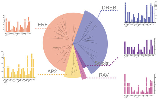 AP2 subfamily genes are implicated in the developmental processes of flowers and seeds [3,4]. In contrast, ERF subfamily genes specifically contribute to plant defense against biotic stressors and pathogens [5], while CBF/DREB subfamily genes primarily regulate plant responses to abiotic stressors such as osmotic and cold stress [6,7]. However, members of the RAV subfamily play diverse roles, including bud outgrowth and leaf senescence, as well as responses to pathogen infections and abiotic stresses [8,9]. A small subfamily, known as Soloist, possesses a single AP2 domain but exhibits highly divergent sequences compared to other AP2/ERF genes. These Soloist genes play pivotal roles in enhancing plant salt tolerance and response to pathogens [10,11,12]. Furthermore, multiple studies have studied the functional characterization of multiple members of the AP2 family in plant growth and development, including flower [13,14], seed [15,16], and leaf development [17]. TFs belonging to the ERF family are the important downstream regulators of the ethylene-mediated stress-response signaling pathways, which are involved in multiple processes, such as fruit ripening [18,19] and the resistance and tolerance to biotic and abiotic stresses, and crosstalk with other hormones [20,21].