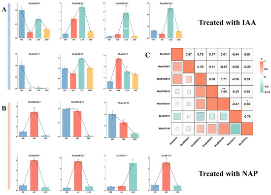 MedAP2/ERF gene expression at 0 h, 6 h, 12 h and 24 h after 100 μmol/L IAA treatment and at 0 h, 6 h, and 24 h after 100 μmol/L NPA treatment. (A) The expression of MedAP2/ERF genes with IAA treatment; (B) The expression of MedAP2/ERF genes with NPA treatment. Relative transcript levels are calculated by real-time PCR with MedActin1 as a standard. Data are means ± SE of three separate measurements based on t-test, taking p < 0.05 as * and p < 0.01 as **. (C) Heatmap shows the correlation of gene expressions between the two treatments.