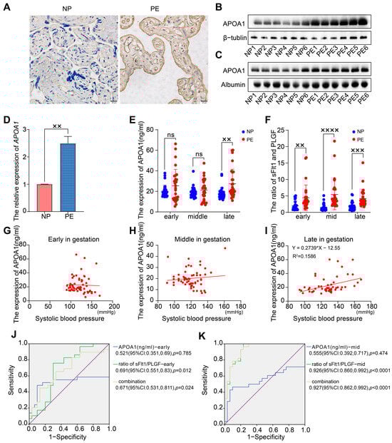The expression of APOA1 is elevated in placental and plasma samples from women with preeclampsia. (A) Immunohistochemistry for APOA1 in placental tissues from NP (n = 12) and PE women (n = 12). (B) Western blot analysis of APOA1 protein levels in placental tissues from NP women (n = 6) and PE women (n = 6). (C) Western blot analysis of APOA1 protein levels in plasma tissues from NP (n = 6) and PE women (n = 6). (D) qRT-PCR analysis of APOA1 in placental tissues from NP (n = 12) and PE women (n = 12). (E) ELISA assay for the expression of APOA1 in plasma tissues during early, mid-term, and late gestation from NP (n = 30) and PE (n = 29) patients. (F) ELISA assay for the ratio of sFlt1/PLGF in plasma tissues during early, mid-term, and late gestation from NP (n = 30) and PE (n = 29) patients. (G) Scatterplot of the level of APOA1 (ng/mL) in plasma tissues and systolic blood pressure during early gestation from 59 women. (H) Scatterplot of the expression level of APOA1 (ng/mL) in plasma tissues and systolic blood pressure during mid-term gestation from 59 women. (I) Scatterplot of the expression level of APOA1 (ng/mL) in plasma tissues and systolic blood pressure during late gestation from 59 women. (J) The ROC curve of the concentration of APOA1 and the ratio of sFlt1/PLGF during early gestation for predicting preeclampsia. (K) The ROC curve of the concentration of APOA1 and the ratio of sFlt1/PLGF during mid-term gestation for predicting preeclampsia. Error bars indicate mean ± SD. The data were analyzed using a one-way ANOVA assay and unpaired Student’s t-test. ×× p-value < 0.01, ××× p-value < 0.001, ×××× p-value < 0.0001. ns, no significance.