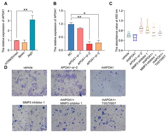 To validate the function of APOA1, trophoblast cell lines were used for further experiments. HTR8/SVneo, Bewo, and Jeg3 are three common trophoblast cell lines. qRT-PCR assays revealed that the expression of APOA1 was highest in Jeg3, lowest in Bewo, and intermediate in HTR8/SVneo cells (Figure 2A). In addition, HTR8/SVneo cells are immortal extravillous trophoblast cells derived from normal first-trimester placentas []; therefore, HTR8/SVneo cells were used in subsequent experiments.