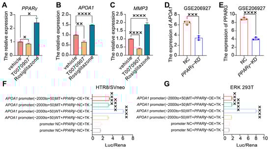 APOA1 was transcriptionally regulated by PPARγ. (A) qRT-PCR analysis of PPARγ in the vehicle, T0070907, and rosiglitazone groups. (B) qRT-PCR analysis of APOA1 in vehicle, T0070907, and rosiglitazone groups. (C) qRT-PCR analysis of MMP3 in vehicle, T0070907, and rosiglitazone groups. (D) The expression of APOA1 in NC and PPARγ-KD cells from GSE206927 datasets. (E) The expression of PPARγ in NC and PPARγ-KD cells from GSE206927 datasets. (F) Dual luciferase assay for the transcriptional activity of PPARγ for the promoter of APOA1 in HTR8/SVneo cells. (G) Dual luciferase assay for the transcriptional activity of PPARγ for the promoter of APOA1 in HEK 293T cells. MT, mutation; WT, wild type; NC, normal control; OE, overexpressed. Error bars indicate mean ± SD. The data were analyzed using a one-way ANOVA assay and unpaired Student’s t-test. × p-value < 0.05, ×× p-value < 0.01, ××× p-value < 0.001, ×××× p-value < 0.0001.