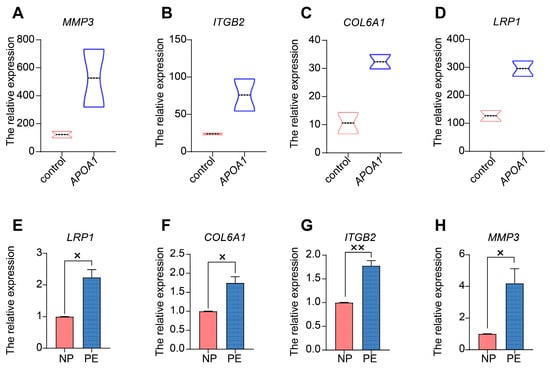 Next, we selected several significant DEGs for validation by qRT-PCR in placentas from patients with PE and NP, including MMP3 (matrix metallopeptidase 3), ITGB2 (integrin beta2), COL6A1 (Collagen type VI alpha 1), and LRP1 (low-density lipoprotein receptor-related protein 1). These genes were all increased in APOA1 over-expressed 4T cells (Figure 4A–D). Among these, MMP3 was most significantly elevated in APOA1 overexpressed groups, with an approximately 3.6-fold increase (Figure 4A). In addition, these genes were elevated in the placentas of preeclampsia patients (Figure 4E–H), including LRP1 (Figure 4E), COL6A1 (Figure 4F), ITGB2 (Figure 4G), and MMP3 (Figure 4H). Interestingly, MMP3 still has the largest increase, with about a 2.6-fold increase. Therefore, the effect of MMP3 was the most significant. Furthermore, we investigated the function of MMP3 by performing CCK-8 and Transwell assays. The results showed that the proliferation and invasion of trophoblast cells were elevated after treatment with MMP3 inhibitor 1 but could be rescued by adding rhAPOA1 protein (Figure 2C,D). The expression of MMP3 decreased in HTR8/SVneo cells treated with T0070907 and increased in HTR8/SVneo cells treated with rosiglitazone (Figure 3C). These results indicate that APOA1 might inhibit trophoblast proliferation and invasion by regulating these genes, particularly MMP3.