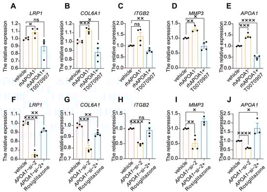 APOA1 functions by regulating several downstream targets. (A–E) qRT-PCR analysis of LRP1 (A), COL6A1 (B), ITGB2 (C), MMP3 (D), and APOA1 (E) in vehicle, rhAPOA1, and rhAPOA1 + T0070907 groups. (F–J) qRT-PCR analysis of LRP1 (F), COL6A1 (G), ITGB2 (H), MMP3 (I), APOA1 (J) in vehicle, APOA1-si-2, and APOA1-si-2 + rosiglitazone groups. Error bars indicate mean ± SD. The data were analyzed using a one-way ANOVA assay. × p-value < 0.05, ×× p-value < 0.01, ××× p-value < 0.001, ×××× p-value < 0.0001. ns, no significance.