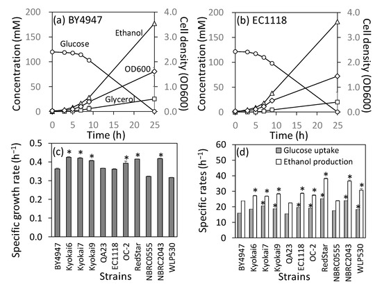 A comparison of the 11 strains showed that the three sake strains (Kyokai6, Kyokai7, and Kyokai9) tended to have higher specific growth, glucose consumption, and ethanol production rates than those of BY4947 (Figure 1c,d). Other strains showed elevated specific rates of glucose consumption and ethanol production, except for QA23 and NBRC0555 (Figure 1d). However, increased specific growth rates were observed only in OC-2, RedStar, and NBRC2043 (Figure 1c). Particularly, the specific ethanol production rates of baker’s yeast, RedStar and NBRC2043, reached 38.2 ± 0.3 and 36.5 ± 0.6 mmol (g DCW h)−1, which were 160% and 153% of the rate observed for BY4947, respectively (Figure 1d). These results are generally consistent with those reported in previous studies [18].