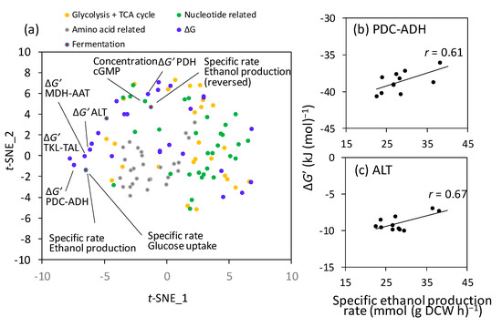 Subsequently, a data matrix of the 84 metabolite concentrations, 26 ΔG′ values, and four specific rates was analyzed using the t-distributed stochastic neighbor embedding (t-SNE) method (Figure 2a). In addition to the specific rates of cell growth, glucose consumption, and ethanol production, the reversed specific ethanol production rate was used to detect negative correlations. The results of t-SNE showed that the specific rates of ethanol production and glucose consumption were located at very similar positions (Figure 2a), reflecting a close correlation between these rates (Figure 1d). Additionally, the ΔG′ of four pathways, namely the ΔG′(PDC-ADH), ΔG′(alanine transaminase (ALT)), ΔG′(transketolase (TKL)-transaldolase (TAL)), and ΔG′(malate dehydrogenase (MDH)-aspartate aminotransferase (AAT)), were close to the specific rate of ethanol production (Figure 2a, the definition of reaction names is shown in Table S3). Moreover, ΔG(pyruvate dehydrogenase (PDH)) and cGMP were located near the reversed specific ethanol production rate. Hierarchical clustering analysis using a smaller data matrix, including 26 ΔG′ values and four specific rates, confirmed that the specific ethanol production rate, ΔG′(PDC-ADH), ΔG′(ALT), ΔG′(TKL-TAL), and ΔG′(MDH-AAT) were in the same cluster (Figure S1).