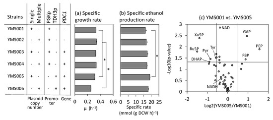 The results of the metabolic analyses described previously suggest that the activation of the pyruvate-consuming reaction increases the ethanol production rate. To confirm this finding, PDC1 from S. cerevisiae was overexpressed in the haploid laboratory yeast strain (YPH499). PDC1 encodes a major isoform of PDC, the initial enzyme involved in ethanol biosynthesis from pyruvate [28]. Strains YMS003 and YMS004 were constructed by introducing single- and multi-copy plasmids expressing PDC1 under the control of the PDC1p promoter, respectively. Flask-scale batch cultivation showed that the specific rates of ethanol production and cell growth of the YMS003 and YMS004 strains were similar to those of the vector control strains (YMS001 and YMS002), likely because of insufficient overexpression of PDC1 (Figure 3a,b).
