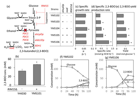 Furthermore, the high fermentation capability of the sake (Kyokai) strain is attributable to a loss-of-function mutation in RIM15, which encodes a protein kinase involved in cell proliferation in response to nutrients [16,17,23]. The name RIM15 was derived from “Regulator of IME2 (Inducer of MEiosis)” [24]. Additionally, ethanol fermentation by a laboratory strain was improved by deleting RIM15 [16,17]. Disruption of RIM15 may contribute to increased tolerance to heavy metals and improve the glycerol assimilation ability of S. cerevisiae [25,26]. However, the effect of the RIM15 deletion on 2,3-BDO production remains to be comprehensively investigated.