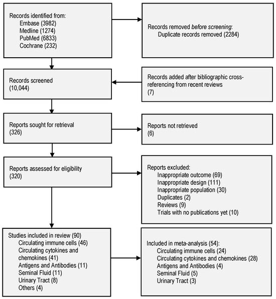 The initial search identified 12,321 studies from the four databases (Figure 1). After deduplication, 10,037 titles and abstracts were screened, and 312 studies were screened for full text (four studies were not retrieved, and 10 trials were without publications). The four studies were published before 1980 [16,17,18,19]. A total of 90 studies were included Supplemental Table S3). Excluded studies used non-immunological markers, studied animals, or lacked populations with no SCI. A total of 54 (60%) studies were included in the meta-analysis, with 22 immune markers from 3191 study participants (1813 with SCI and 1378 without SCI). The characteristics of this group are summarized in Table 1. The narrative summaries of all included studies can be found in Supplemental Tables S4–S11.