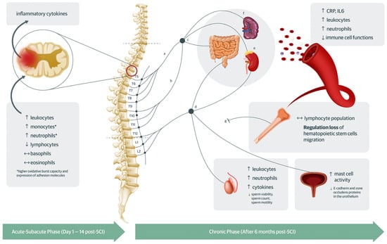 The pathophysiological process involved in SCI-IDS as captured in this systematic review. At the acute–subacute phase, the immune status is mainly driven by the injury with recruitment of leukocytes primarily by neutrophils and monocytes with higher release of inflammatory cytokines that direct the immune cells. Upon resolution of the lesion site inflammation, there is persistence of low-grade inflammation and higher levels of circulating leukocytes, particularly neutrophils. This is secondary to (1) the loss of sympathetic innervation in immune-related organs, (2) exposure of the immune cells to hormone imbalance, particularly to cortisol and norepinephrine, and (3) the membrane disruptions and tissue remodeling after loss of innervation as seen in higher cytokines and immune cells in previously selectively permeable or impermeable membranes (e.g., like in the testis) or increased activity of mucosal immune cells with decreased expression of junction proteins in the urothelium. Legend: a—greater splanchnic nerve; b—lesser splanchnic nerve; c—celiac ganglion; d—inferior mesenteric ganglion; f—spleen; e—adrenal glands; g—sympathetic nerves depending on the bone marrow site; ↓ significantly lower in SCI vs without SCI, ↑ significantly higher in SCI vs without SCI, ↔ no significant difference in SCI vs without SCI.