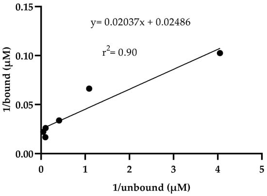 These data indicate how the absorbance of the bound drug is proportional to the free drug (Table 2, Figure 1). In addition, in a second plot of the reciprocals of bound drug versus free drug (Figure 2), where linearity between bound and free drug was observed, the equation obtained was y = 0.02037x + 0.02486 (r2 = 0.90). Additionally, an affinity constant Ka of 1.22 µM−1 and a dissociation constant Kd = 0.81 µM were obtained.