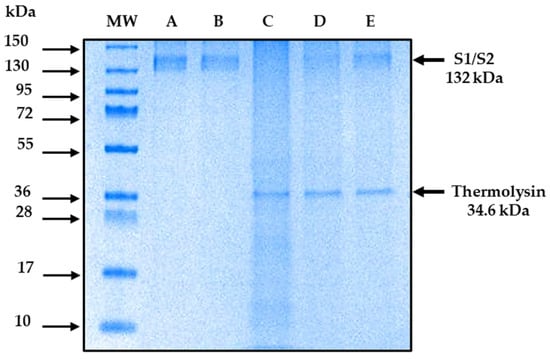 The DARTS method is capable of showing the interaction between the recombinant S1/S2 protein and ivermectin. The results show that the recombinant S1/S2 protein interacts with ivermectin. Figure 3 illustrates a representative polyacrylamide gel (the gels were run on three independent occasions) stained with Coomassie blue that shows the protection of S1/S2 protein (132 kDa) in the presence of ivermectin and conditions of proteolyzed protein (Figure 3, lane D and E). In contrast, the protein was degraded in the absence of the drug (Figure 3, lane C). In comparison, no difference was observed in the same samples that underwent mock digestion (Figure 3, lane B). In addition, a protein of 34.6 kDa is expected due to the presence of thermolysin. These data indicated that there is no degradation of the S1/S2 due to its interaction with ivermectin; however, the best protection was observed in the higher ratio of ivermectin interaction (Figure 3, lane E). In addition, the densitometric analysis showed a higher density in the band in lane E compared to the density of the band in lane C, indicating that there is a higher protection of the protein-to-thermolysin activity with the 1:100 ratio of the protein–ligand interaction (Figure 4).