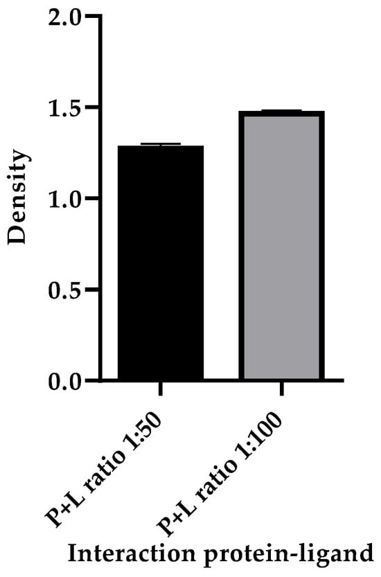 Densitometric analysis. Data represent mean densities ± SD from three independent experiments. A lower density was observed in the 1:50 ratio protein–ligand interaction band compared to the 1:100 ratio interaction band, indicating that the protection of protein S against thermolysin activity is higher in the 1:100 ratio protein–ligand interaction. Thermolysin is resistant to these experimental conditions, so it was used as a loading control.