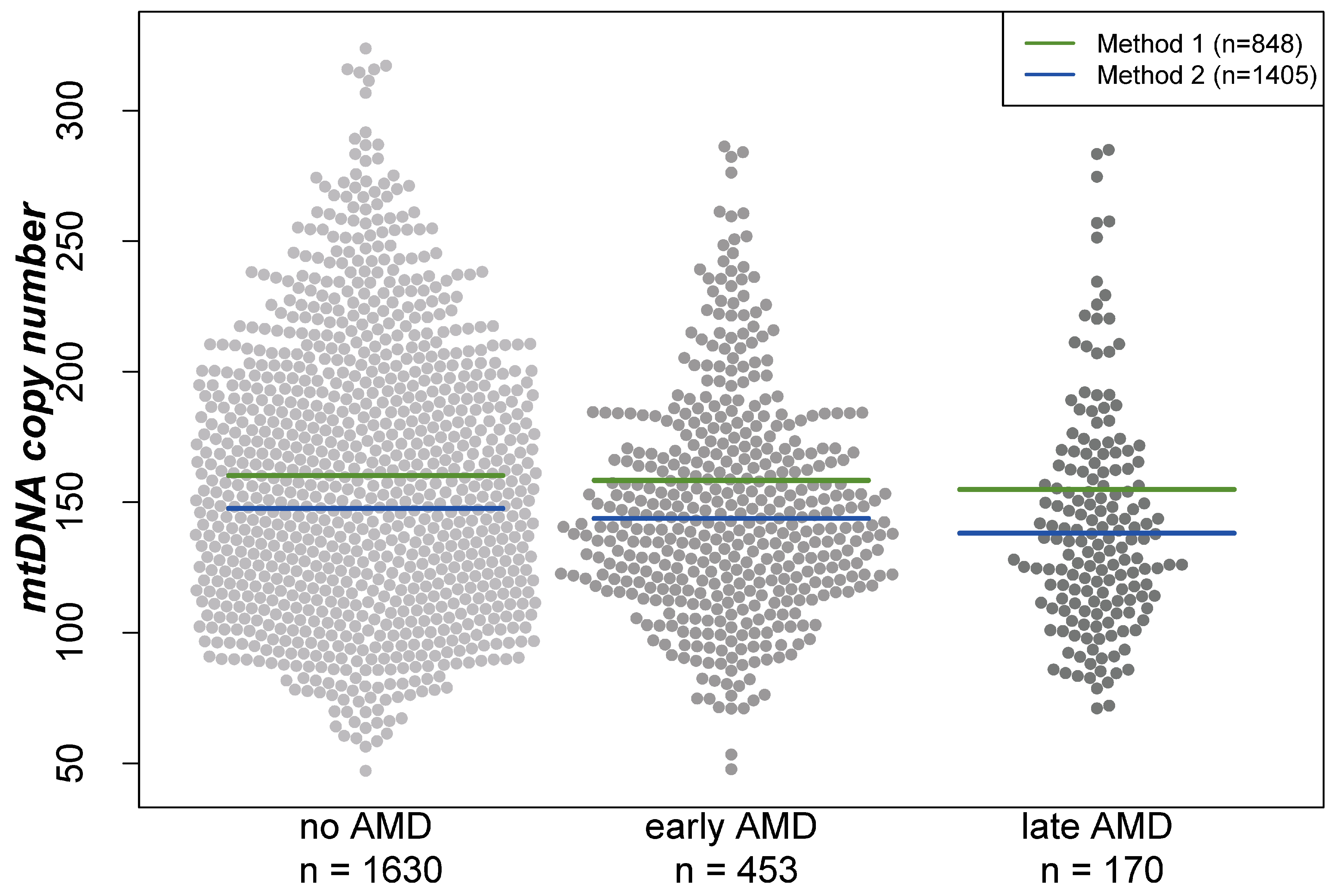 Koller, A.; Lamina, C.; Brandl, C.; Zimmermann, M.E.; Stark, K.J.; Weissensteiner, H.; Würzner, R.; Heid, I.M.; Kronenberg, F. Systemic Evidence for Mitochondrial Dysfunction in Age-Related Macular Degeneration as Revealed by mtDNA Copy Number Measurements in Peripheral Blood. Int. J. Mol. Sci. 2023, 24, 16406. https://doi.org/10.3390/ijms242216406