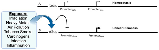 Exposure to environmental insults, such as irradiation or inflammation, alter DNA methylation and gene isoforms to promote cancer. (A) Several genes have been identified as having alternative promoters, Promoteralpha and Promoterbeta, with the upstream promoter located near CpG-islands that are the target of DNA methylation. Expression may be primarily from the upstream promoter, but this does not preclude expression from the downstream promoter, which may reflect the homeostatic balance of the individual isoforms and their roles. (B) Upon various environmental exposures, the DNA methylation of the upstream promoter is hypermethylated at nearby CpG sites resulting in the inhibition (arc with crossbar) of the promoter. This may directly or indirectly result in an increase in expression from the downstream promoter, which may affect tumorigenesis via the imbalance between the isoforms and their relative functions. Created with BioRender.com (accessed on 10 October 2023).
