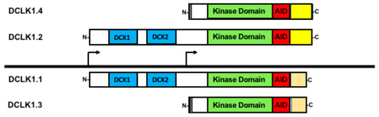 Doublecortin-like kinase-1 (DCLK1) isoforms generated via alternative promoter and alternative RNA splicing. All the four main isoforms contain the kinase domain (green) and its autoregulatory domain (AID) shown in red. Isoforms DCLK1.1 and DCLK1.2 (often referred as DCLK1-L) both contain the microtubule binding domains (DCX, shown in blue) yet differ in their C-terminal domains due to alternative RNA processing (yellow versus orange). From the downstream promoter, two isoforms (sometimes referenced as DCLK1-S) are generated also with distinct C-termini from alternative RNA processing, providing a further means of functional regulation. A short sequence at the N-terminus unique to the two downstream promoter products is shown in grey. Created with BioRender.com (accessed on 10 October 2023).