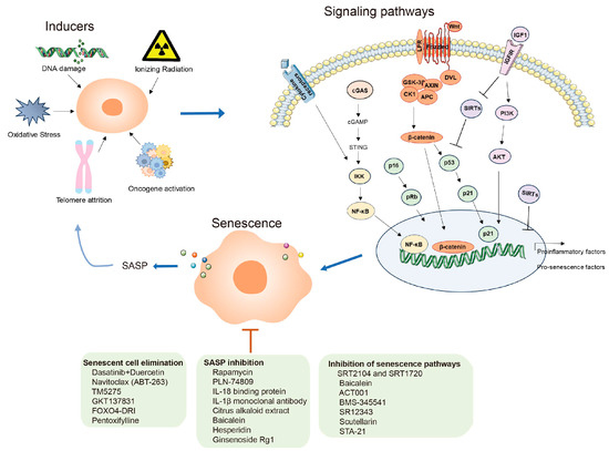156. Laberge, R.M.; Sun, Y.; Orjalo, A.V.; Patil, C.K.; Freund, A.; Zhou, L.; Curran, S.C.; Davalos, A.R.; Wilson-Edell, K.A.; Liu, S.; et al. MTOR regulates the pro-tumorigenic senescence-associated secretory phenotype by promoting IL1A translation. Nat. Cell Biol. 2015, 17, 1049–1061. [Google Scholar] [CrossRef]